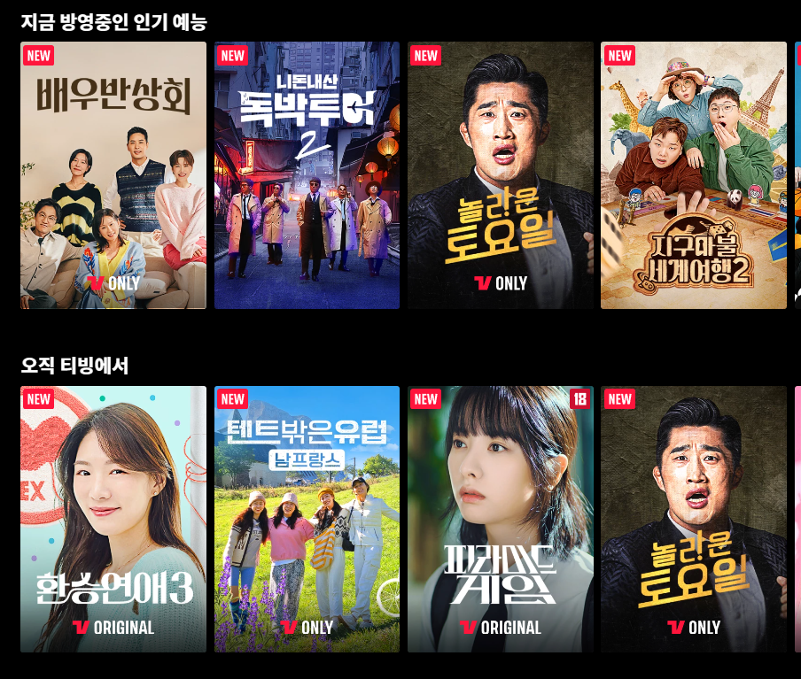 일부 콘텐츠는 무료 구독으로 이용할 수 있지만, 티빙 오리지널 제작물의 전체 범위에 액세스 하려면 유료 구독이 필요할 수 있습니다.